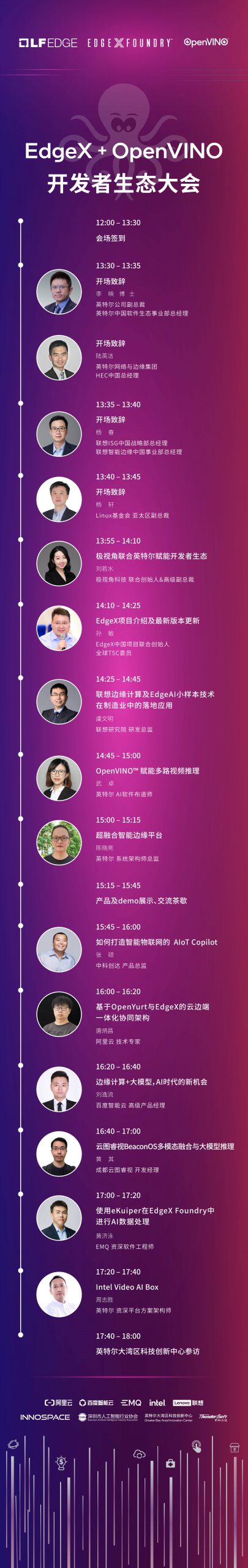 本次活动我们邀请到来自英特尔、联想、Linux基金会、阿里云、百度智能云、中科创达、极视角科技、成都云图睿视、EMQ等十数位边缘计算及人工智能领域的研发专家,共同探讨最新的技术进展、分享实践经验。未来,基于边缘计算、AI大模型、EdgeAI等多元技术的快速迭代,人类将在AI时代的高效运转中获得强力的技术支撑,其中,技术发展和产品创新的实现要素同样值得关切。我们希望通过这次见面会,为AI开发者提供一个交流思想、展示成果的平台。