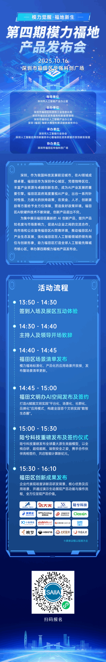 为集中展示福田区最新的AI创新产品,提升产品知名度与市场影响力,促进AI企业之间的交流合作向市场和公众宣传福田区AI营商环境,推动福田区AI产业生态发展,强化福田区在人工智能领域的领先地位与创新形象,助力福田区打造全球人工智能先锋城市核心区,举办第四期模力福地产品发布会。