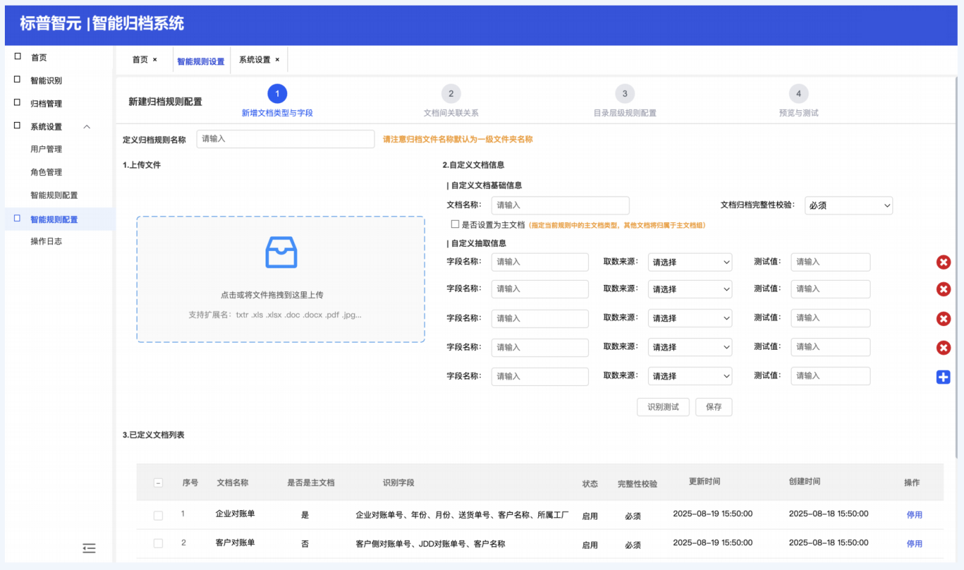 该系统具备全自动化归档、视觉识别、规则匹配与结构化检索等核心能力,能够实现 7×24 小时无人值守运行,将人工从繁重的文件整理与比对中解放出来。通过自定义业务规则,系统可自动完成销售订单、出库单、发票等多单据的匹配与完整性校验;同时,所有文件以结构化方式统一存储,用户可按客户、订单、日期等条件一键检索,几秒钟即可调取完整证据链。