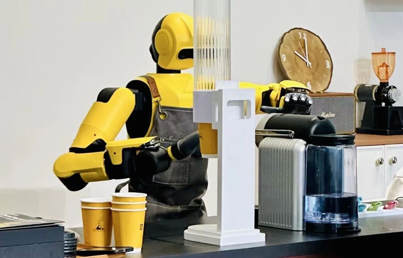 (跨维智能机器人DexForce W1 Pro正在一边制作咖啡,一边向客户介绍咖啡的风味与特色)