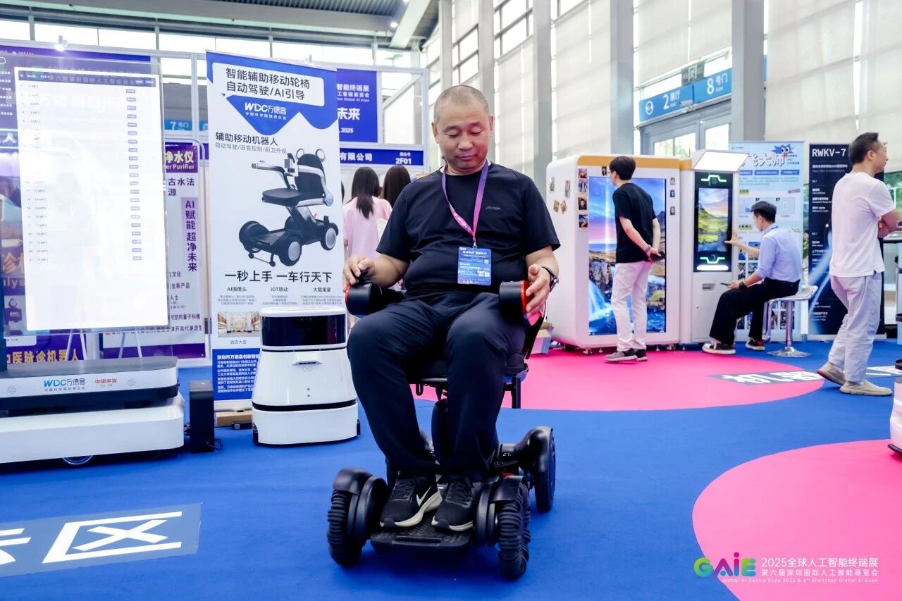 (2025全球人工智能终端展暨第六届深圳国际人工智能展,参会嘉宾正在体验自动驾驶轮椅)