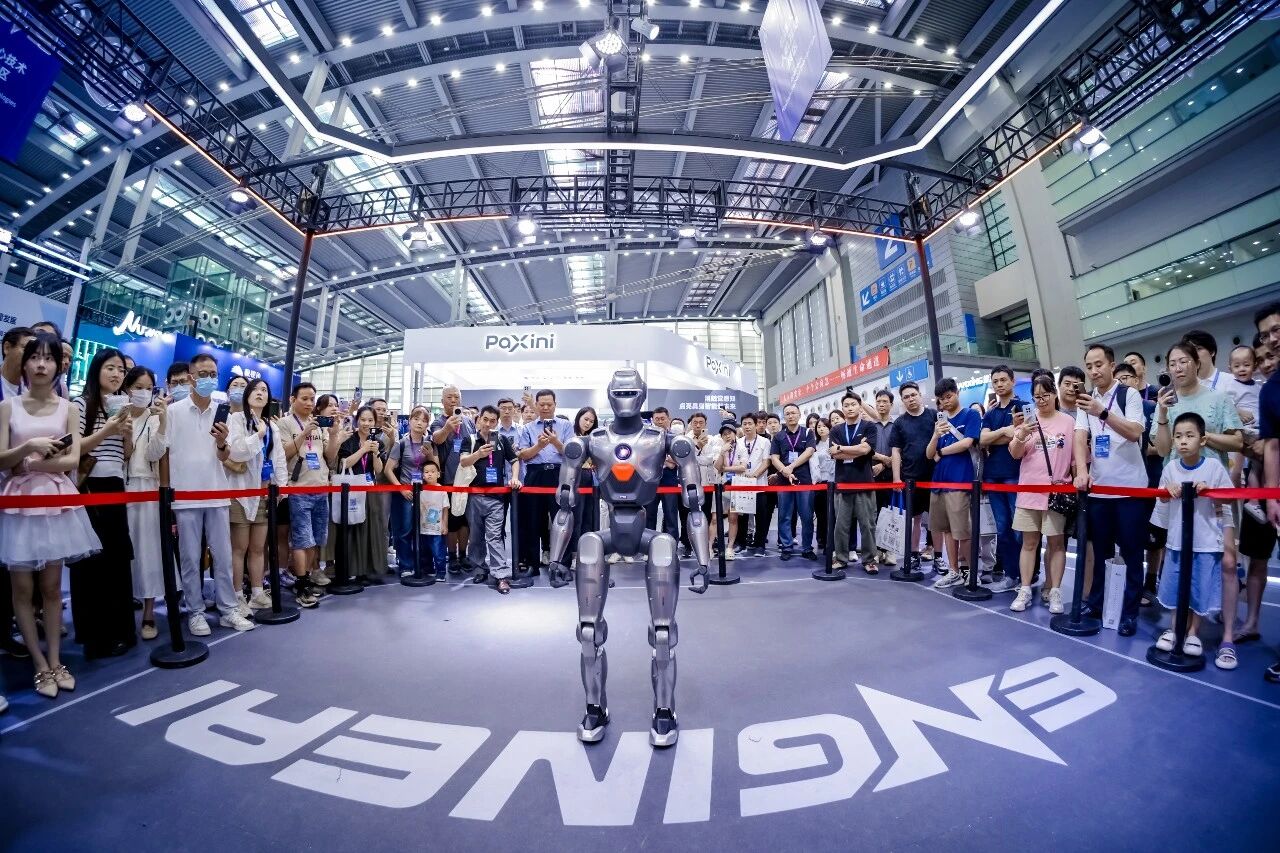 (2025全球人工智能终端展暨第六届深圳国际人工智能展,众擎机器人展台中展示的人形机器人PM01吸引了众多展会参与者驻足)