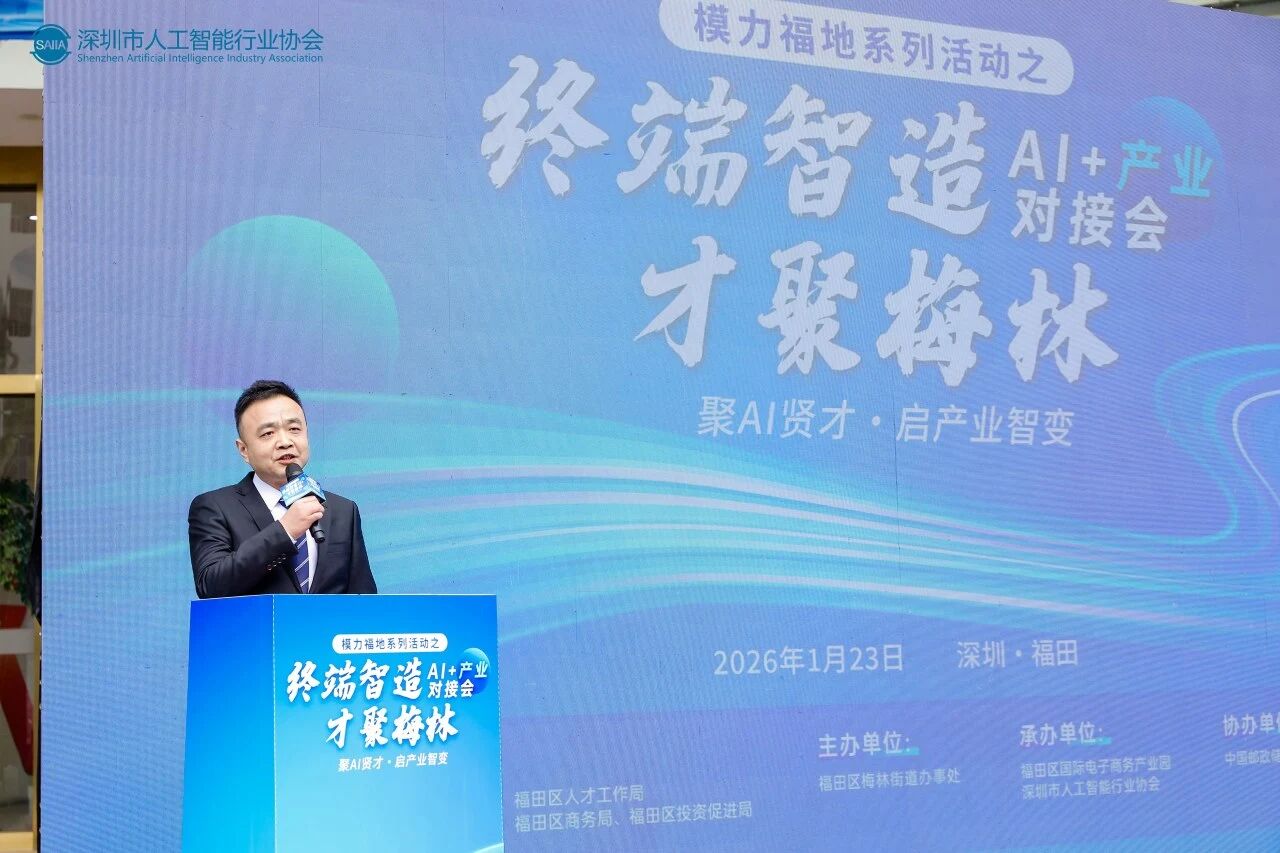 2026年1月23日下午,模力福地系列活动之“终端智造・才聚梅林”AI+产业对接会在福田国际电子商务产业园成功举办。本次活动由中共深圳市福田区委宣传部、福田区人才工作局、福田区商务局、福田区投资促进局、福田区科技和工业信息化局、福田区人工智能产业办公室指导,深圳市福田区梅林街道办事处主办,福田国际电子商务产业园、深圳市人工智能行业协会承办,中国邮政储蓄银行深圳福田区支行协办,吸引了来自AI终端、工业互联网、低空经济、算力服务等领域的100余家企业、投资机构及高层次人才代表参与,旨在通过“政策发布+战略合作+主题演讲+自由对接”的形式,搭建政企协同、产才融合的高效平台,推动“AI+制造”在基层落地生根。